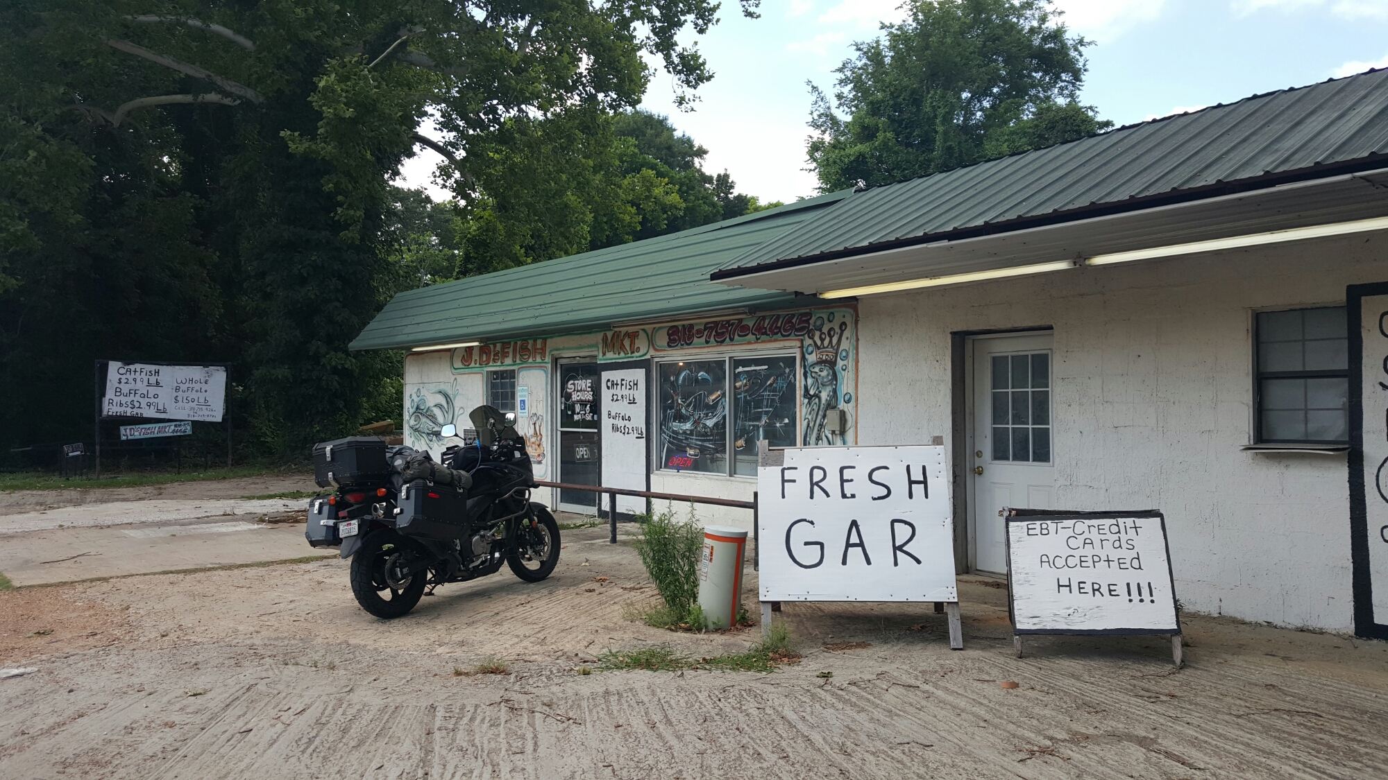 I decide to pull over and check out one of the fish dealers with particularly elaborate hand scrawled signage. I think it was the penmanship of “FRESH GAR” that got me. I walk in to find that there is nobody there. Various tanks of fish and crawfish accompanied by a pungent fishy odor are the subject of my short tour around the space before getting back on my.