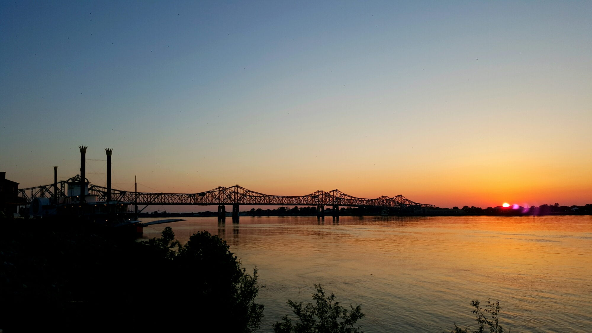 The sunset over the Mississippi River is spectacularly romantic. The silhouetted bridge set against the deeply saturated gradient of the sky is a totally unforgettable view.