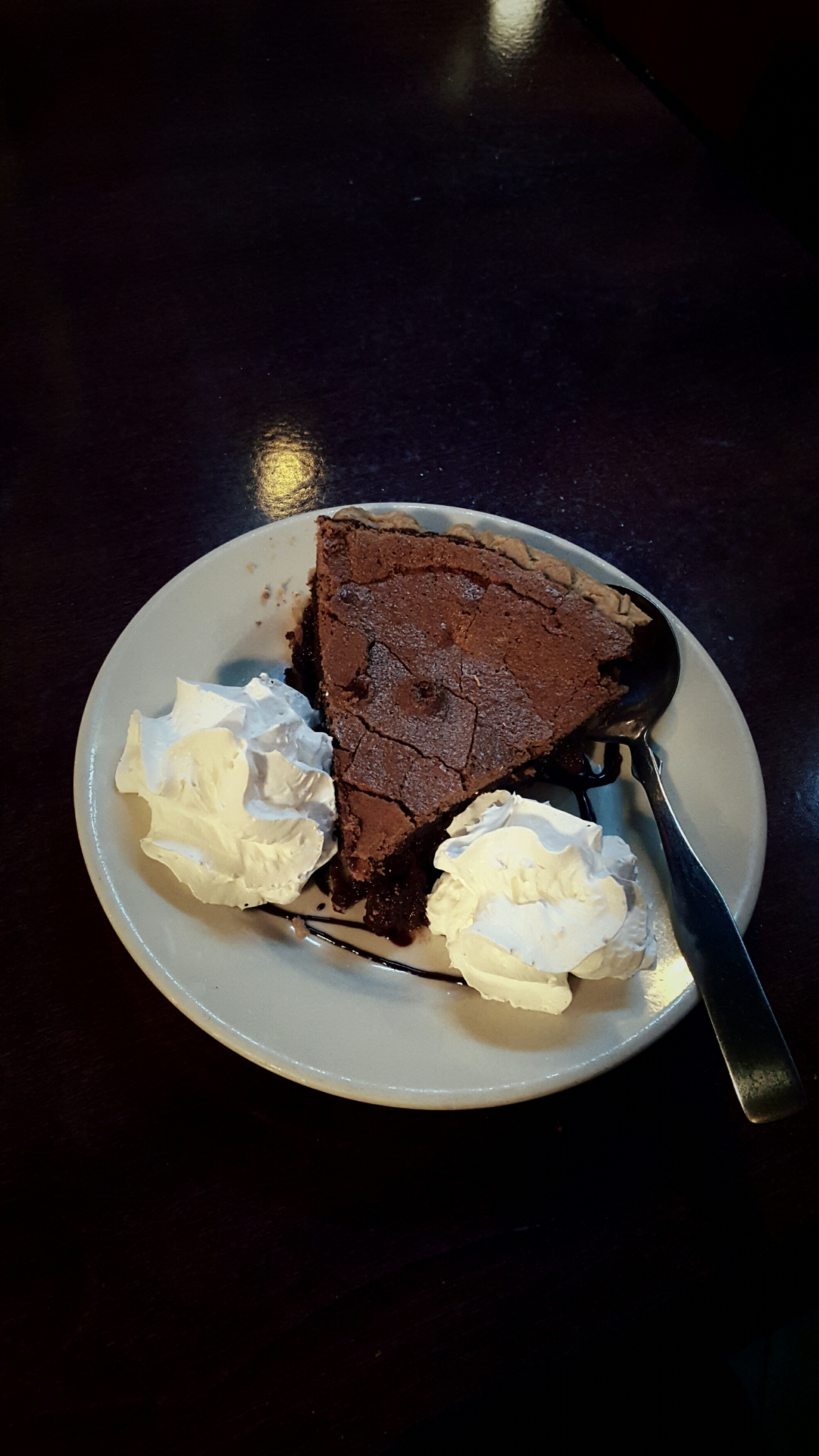 Dinner is served up at a place called Magnolia Grill. The catfish is all it’s cracked up to be. I definitely plan to have it a few more times on my ride through the state tomorrow. A piece of chocolate pecan pie for dessert puts the experience over the top.