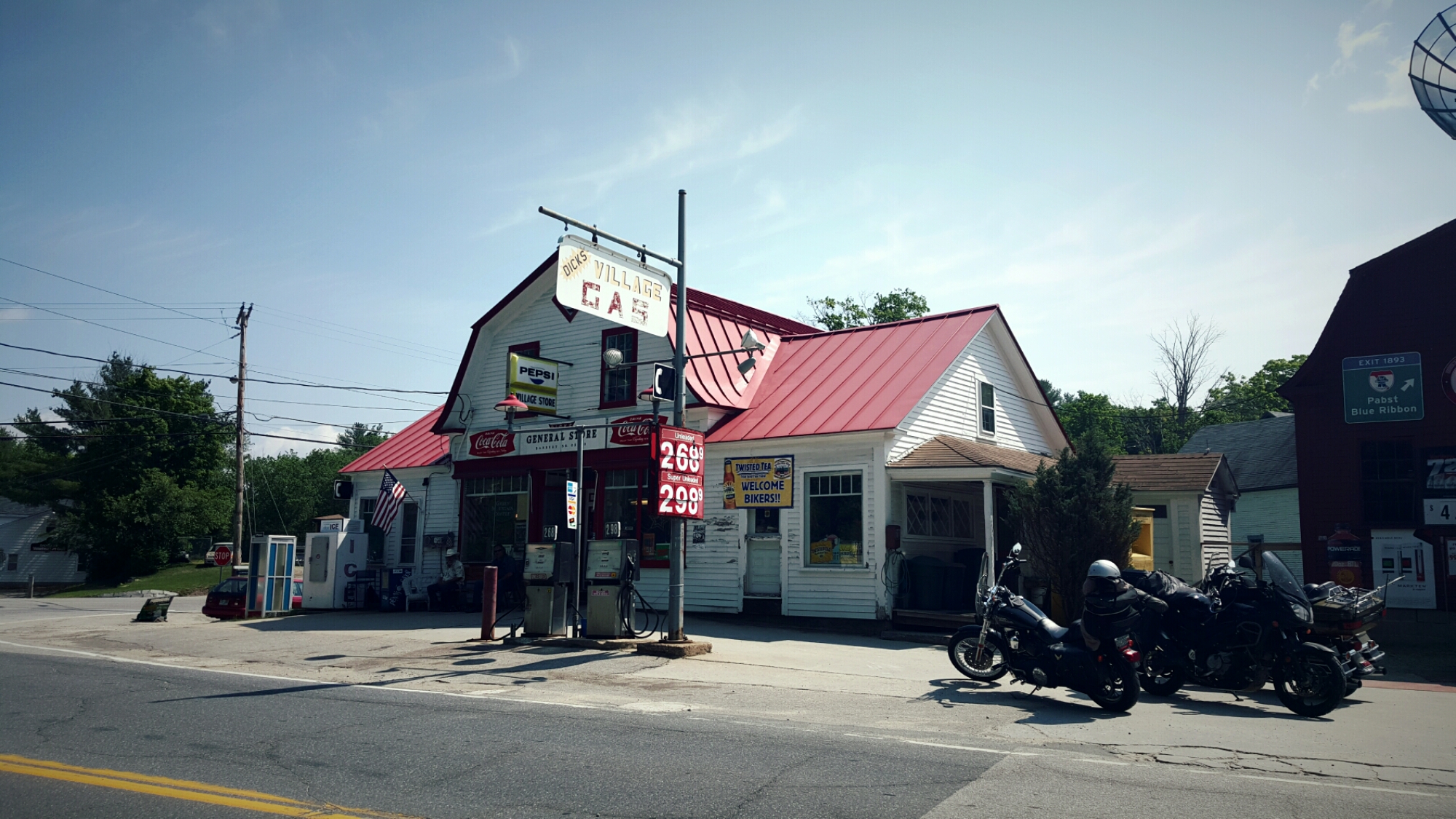 On our way from West Lebanon to the rally in Laconia, we stop for gas at Dicks Village Store in Danbury. After seeing my California license plate, Dick shares some stories about living in Hermosa Beach, CA in 1969. He then points across the street at a series of colored umbrellas providing shade to some weathered picnic tables and asks me if I know what that is. He informs me that its “hippy hill” and thanks to a local law that was passed, its the only place in the state where you can legally drink alcohol in public. Apparently they host regular parties which attract locals and visitors alike. We opt for some petrol and ice tea and continue our ride.