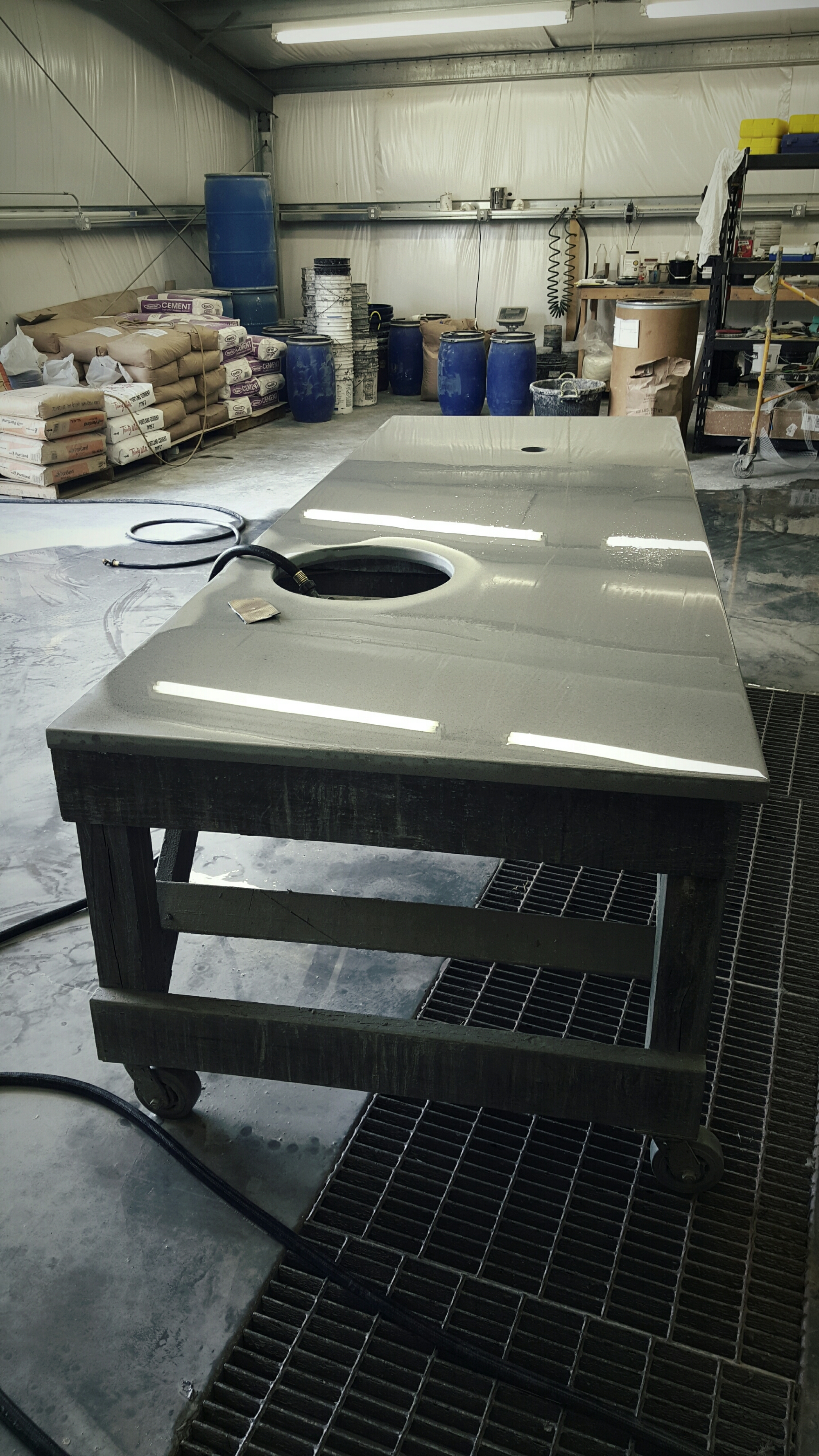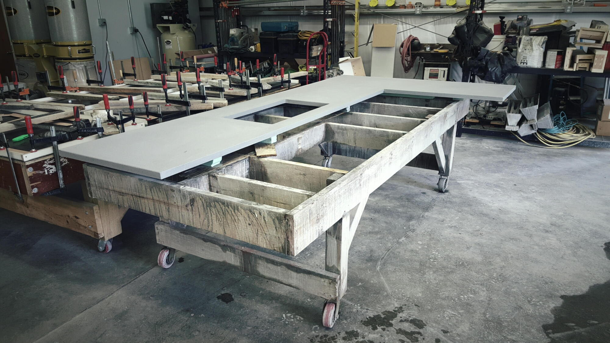 After the delicious peanut butter cup ice cream, we ride over to F&M Castings to check on the counter tops for my mom’s house. I figure my dad would be intrigued by the process given his propensity for making things himself. I’m surprised to see that both counters have been cast and Frank is busily grinding and polishing them already. They look incredible and the color, texture and crispness of the edges is very exciting. I can’t wait to see them installed on my next trip to New York.