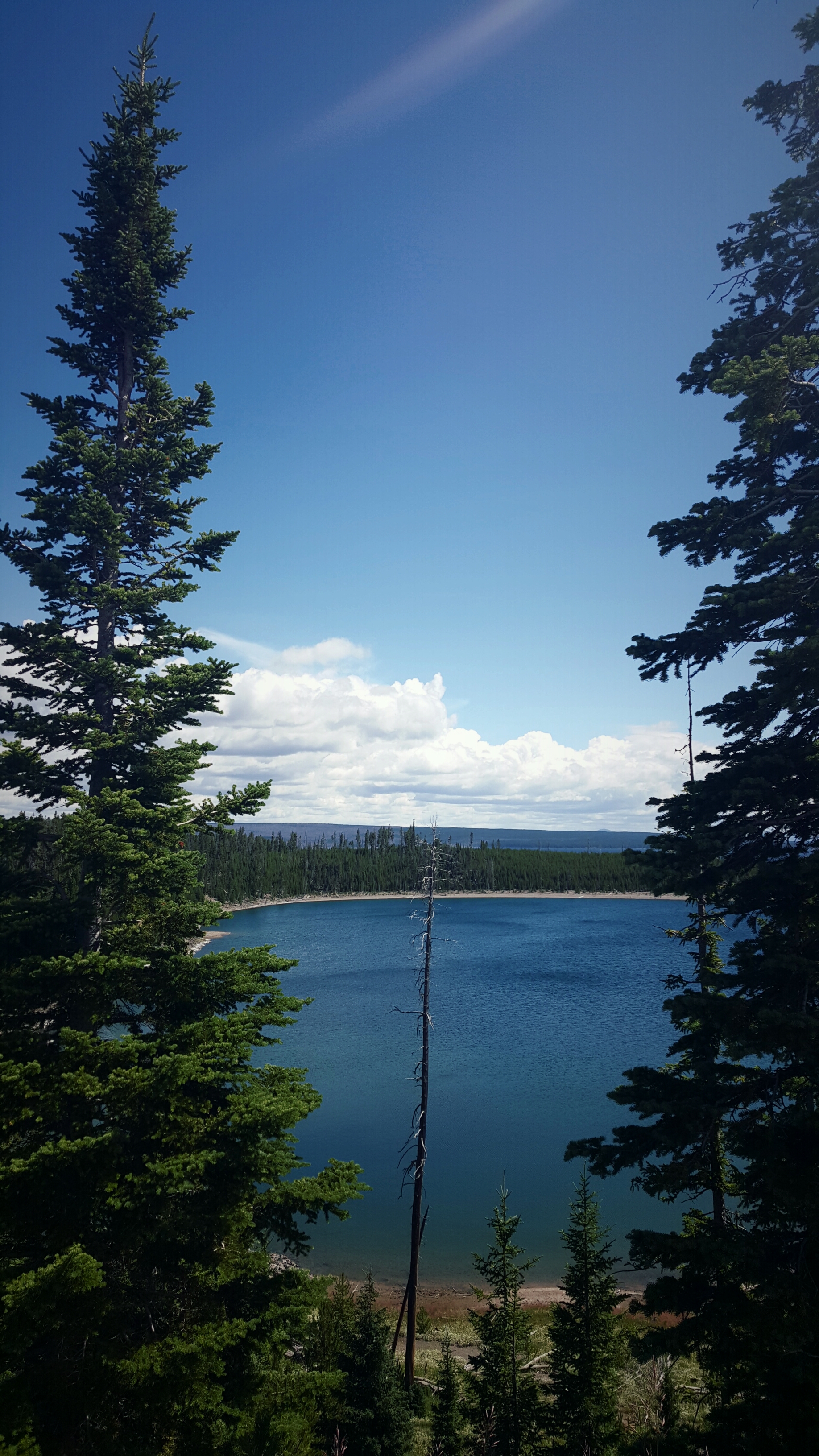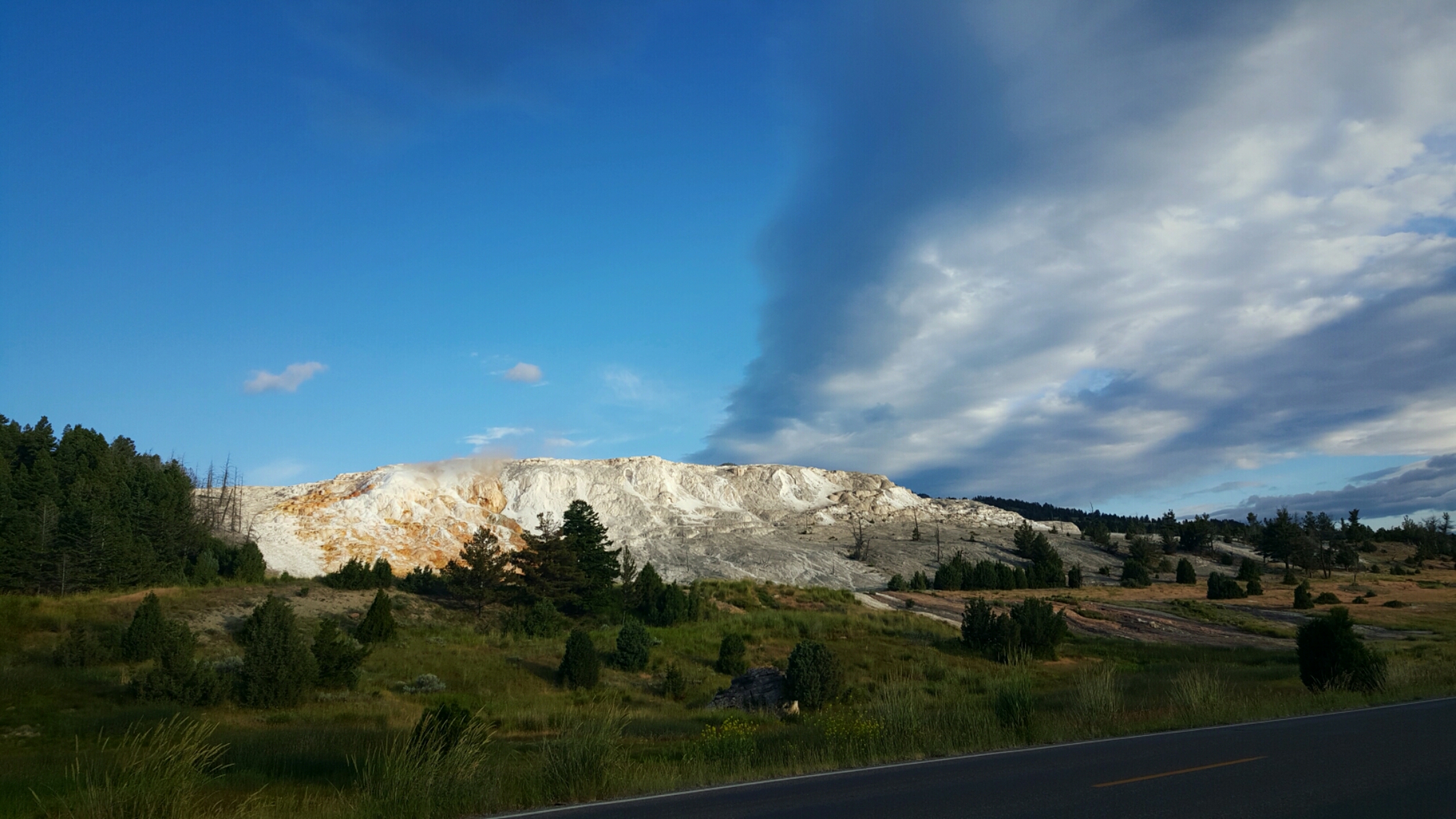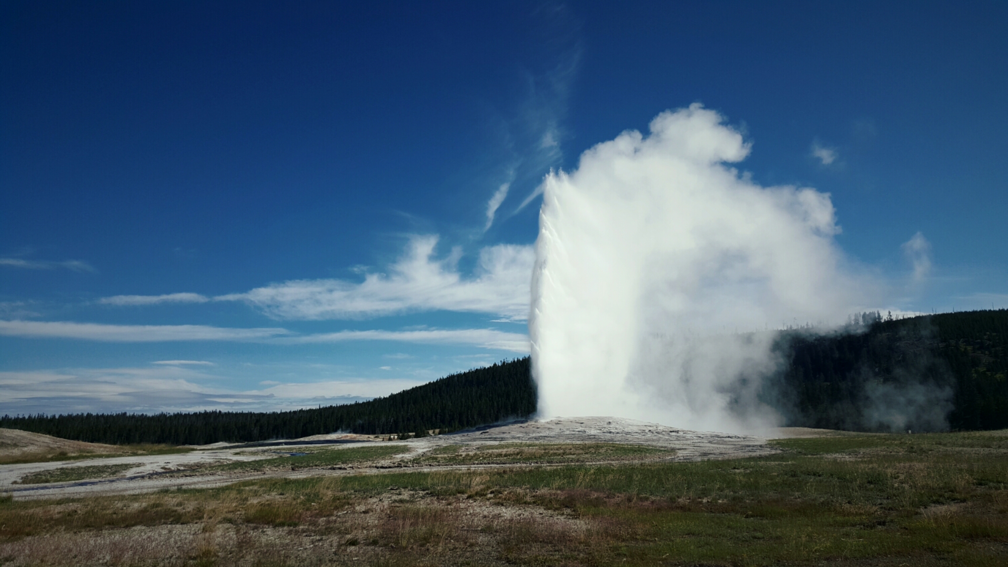 I ride around the mostly quiet park counterclockwise toward the geysers. There are little ones along the sides of the road. I eventually make it to Old Faithful, which is swapped with tourists waiting for the geyser to erupt. Luckily I arrive twenty minutes before the next eruption, which happen every ninety minutes or so. The water and steam spouting out of the ground is mildly impressive and it’s over in a little over a minute. It’s worth seeing once, but it’s definitely not the best facet of the park.