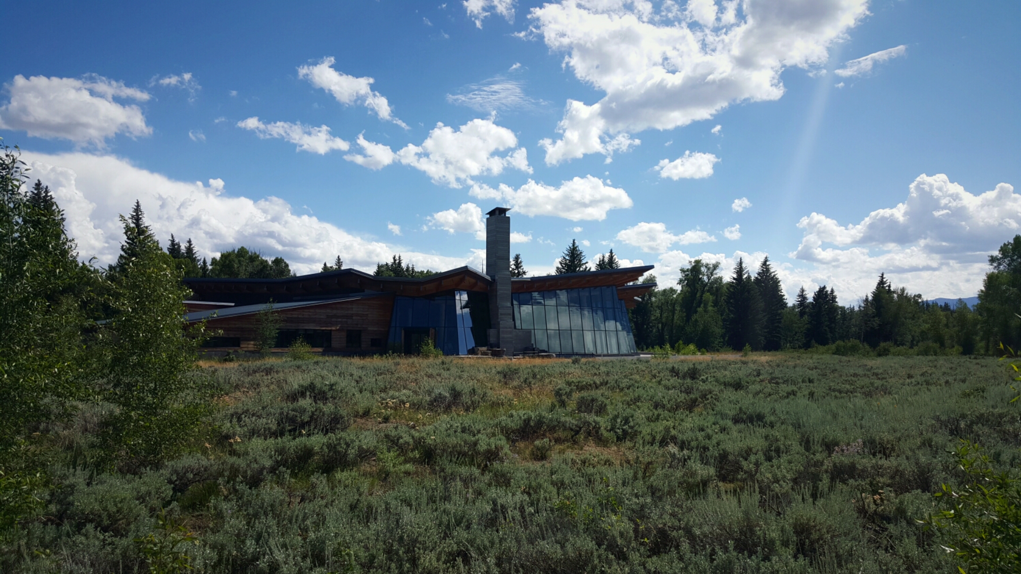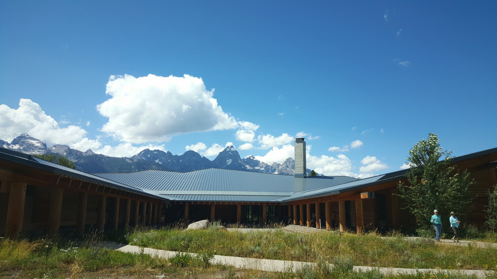 After I claim the next to last campsite in the Signal Mountain Campground, I quickly unpack and jump back on the bike to explore. I head south to see the visitor center designed by Bohlin Cywinski Jackson. They had some pretty nice scenery to take advantage of in the design of the heavy-timber building. On the floor of the center, they incorporated metal inlays which align with each peak and tell visitors the name of the mountain and the elevation. It’s a nice building, but there are a few too many moves given the scenery they had to feature and the procession into the building is lackluster.