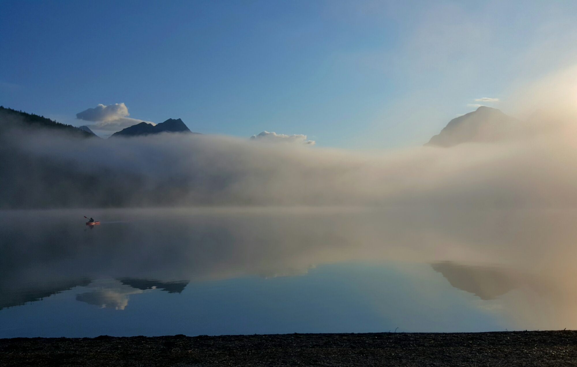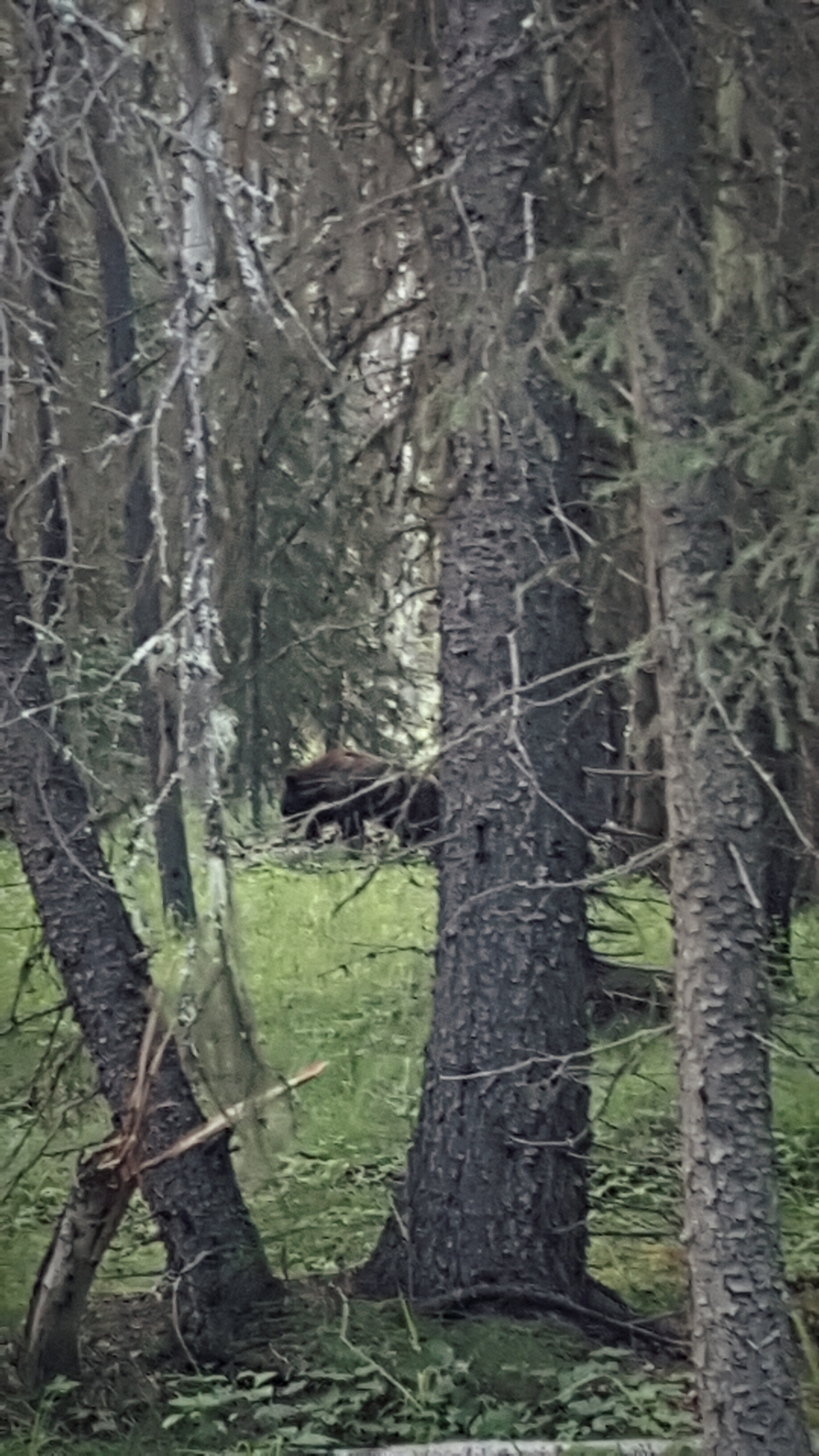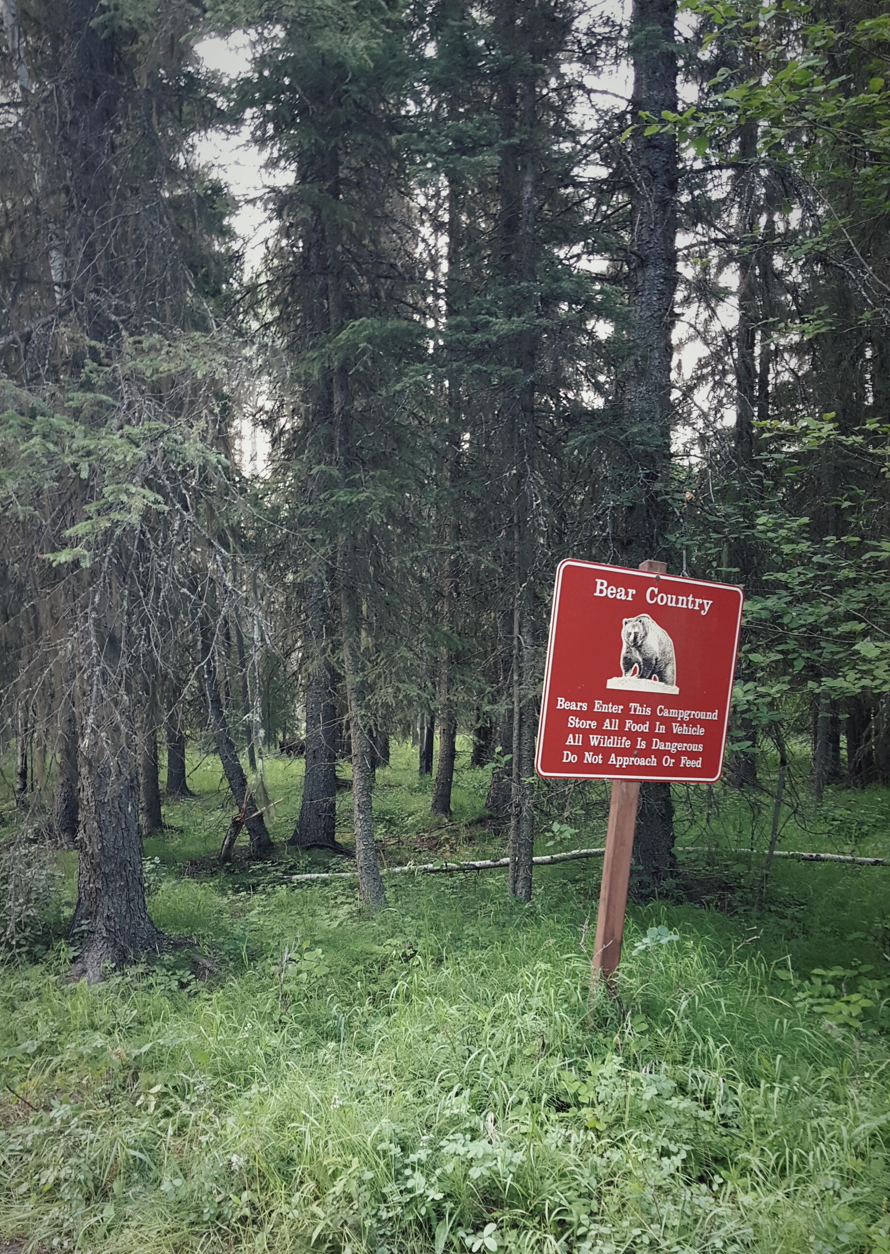 The light and fog on Bowman Lake at 6am produce some eerie imagery. I start my trek down the dirt road and immediately spot a bear tearing apart a rotten log looking for something to eat. The sign next to my campsite warning of “Bear Country” is good foreground to the bear who looks much more friendly than the one depicted.