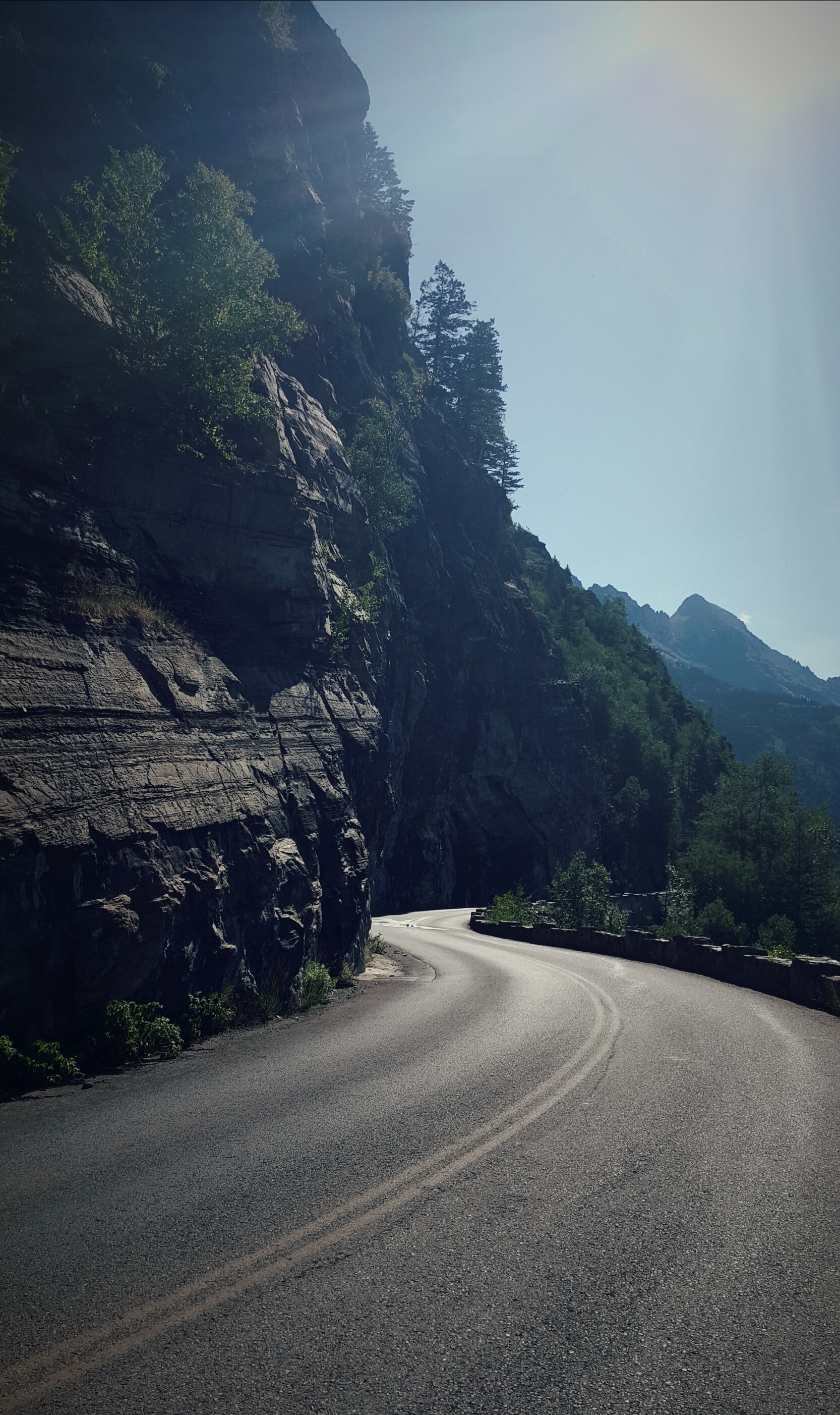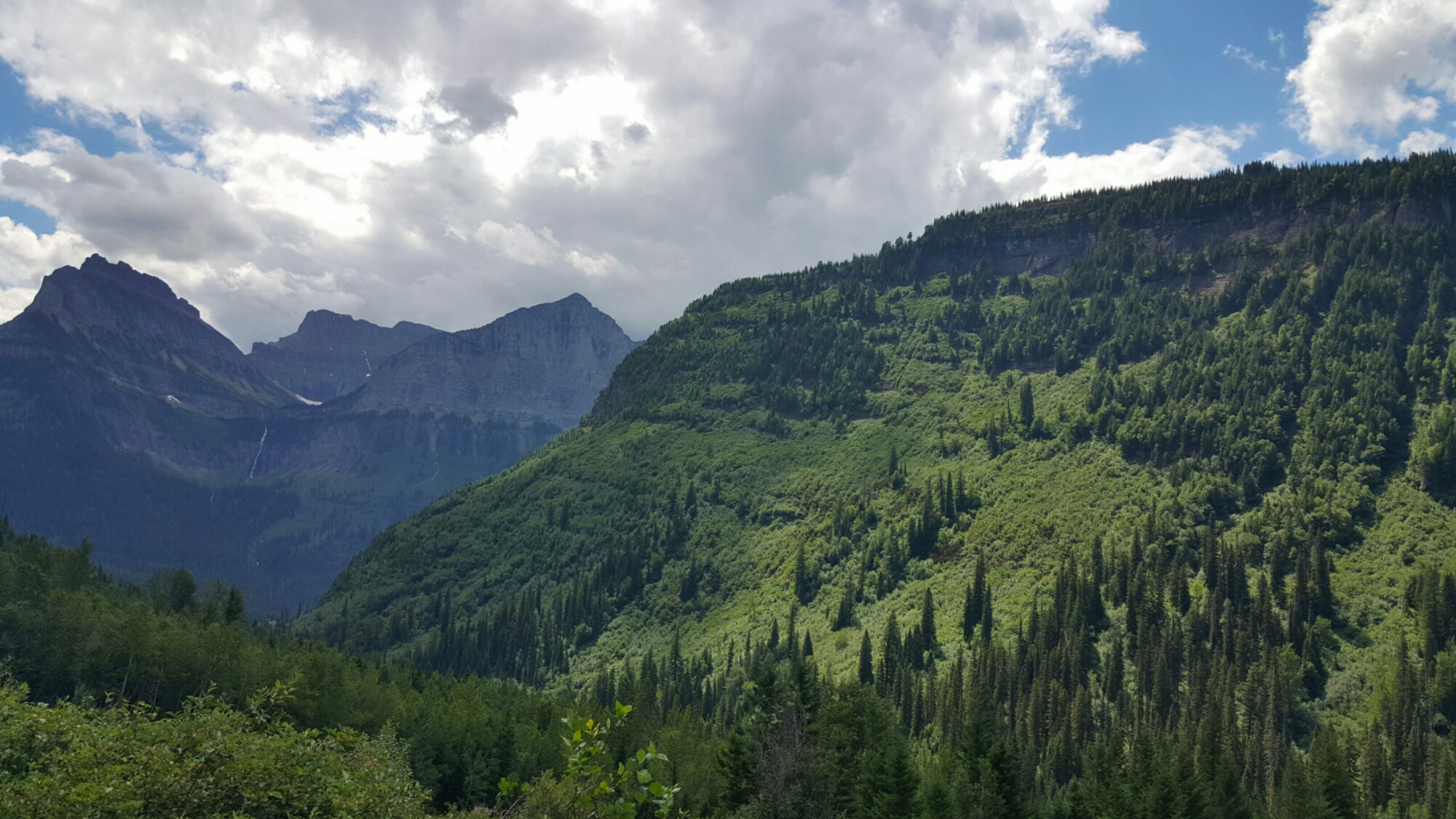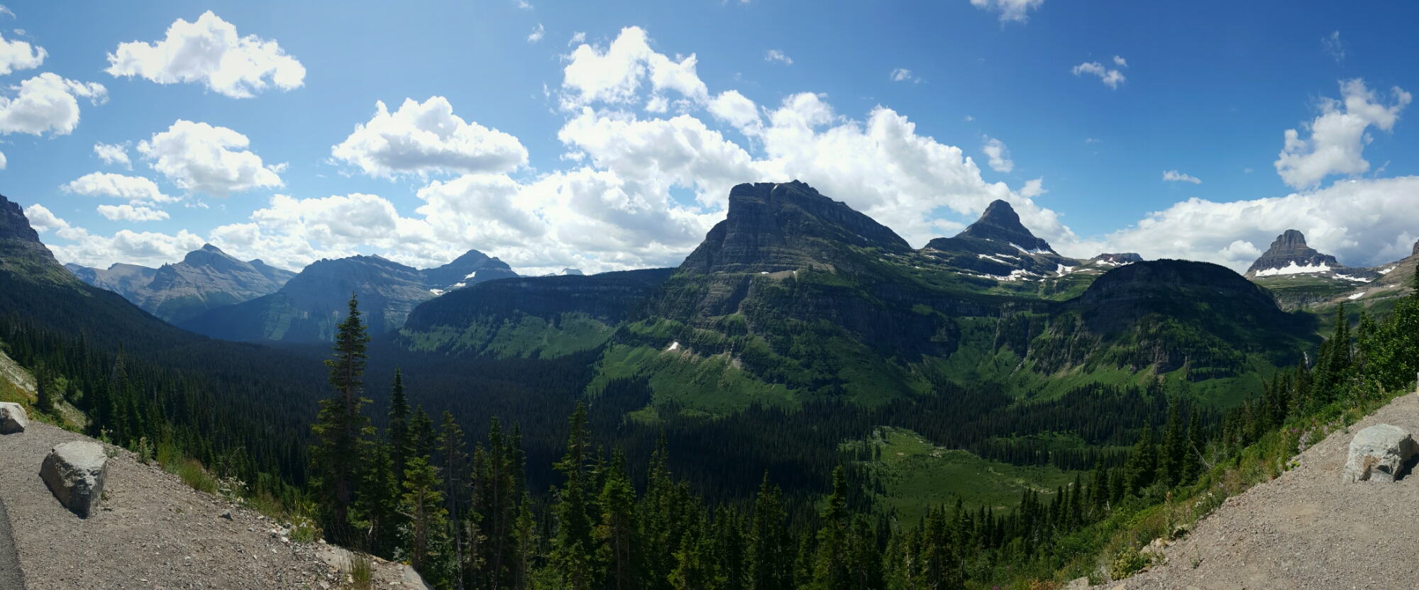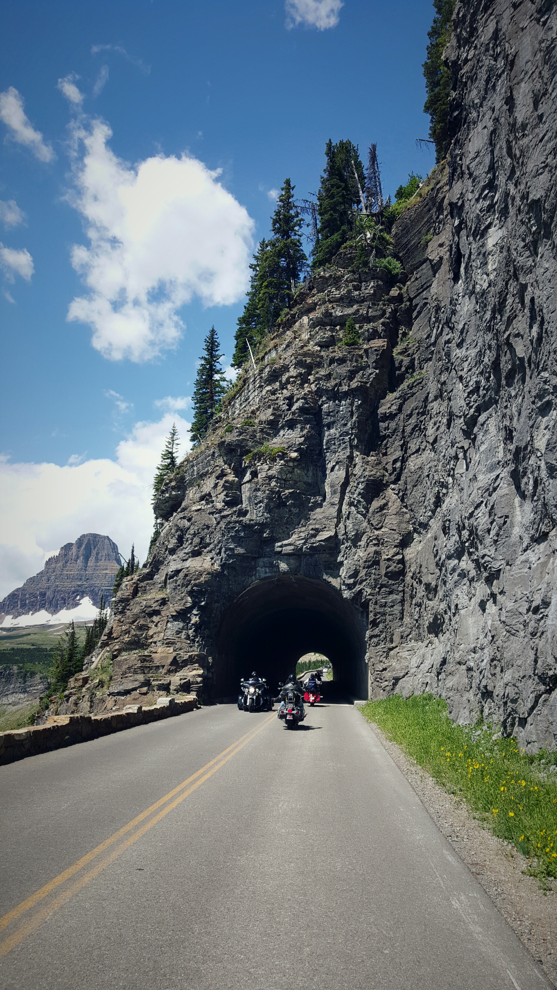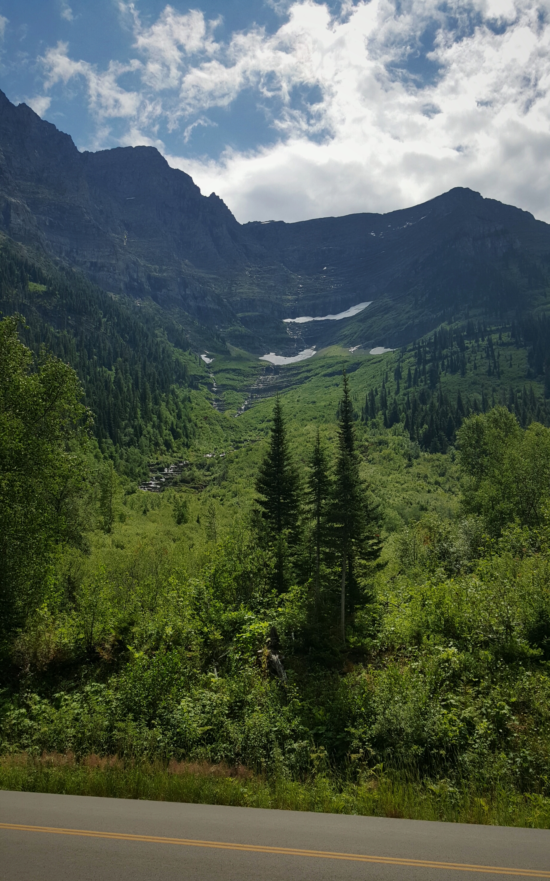 I head for the other road Matt (the shop owner from yesterday) recommended, Going-to-the-Sun Road. This is the only only road that traverses the park and I soon find out where it got it’s name. The winding road very rapidly progresses upward. The “guardrail” protecting me from a few thousand-feet plummet is a twenty-inch high stacked stone wall. I’m not afraid of heights, but more than once I got a little woozy while peering over the edge at speed.