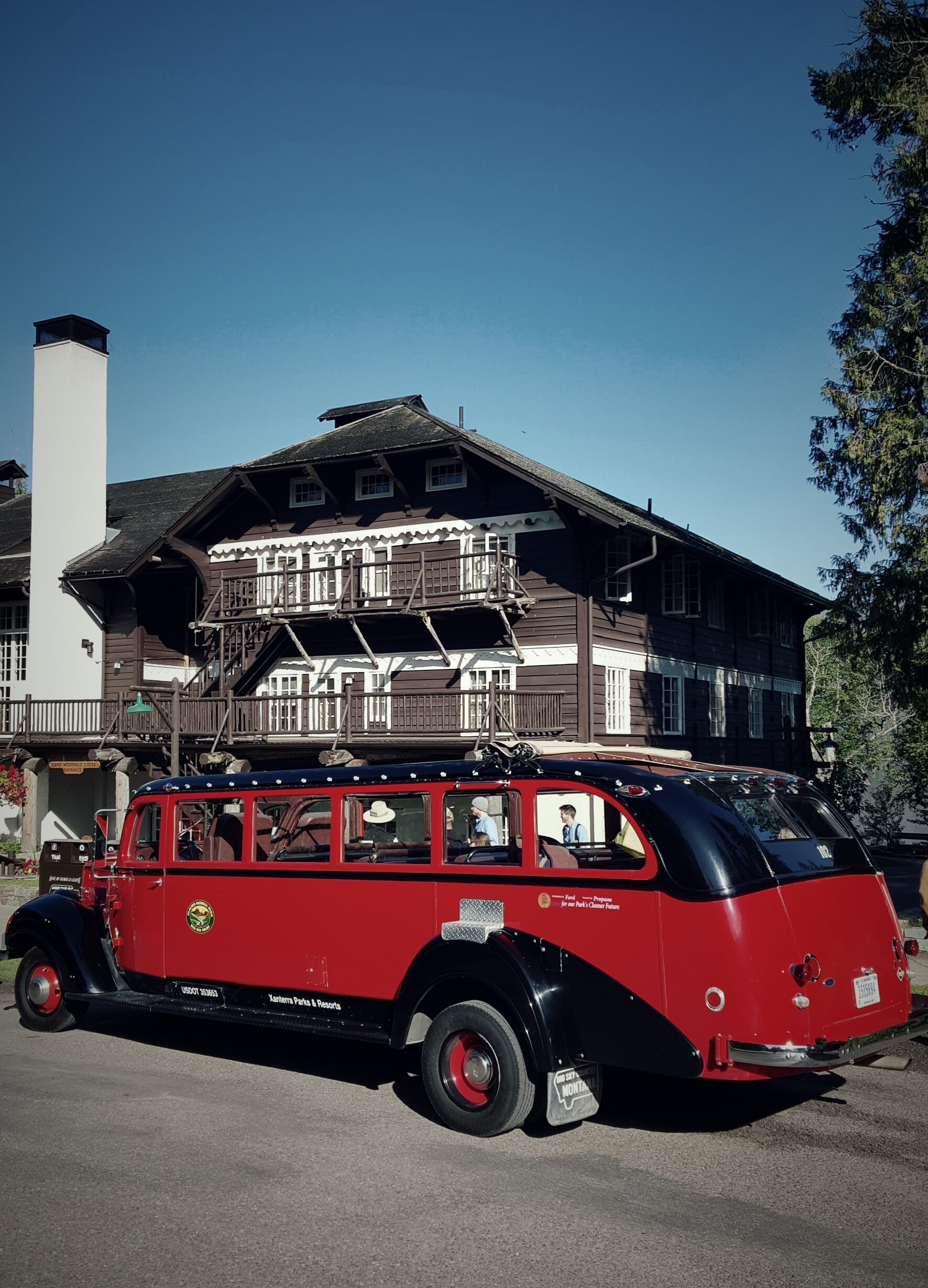 [Red Jammer in front of the historic Lake McDonald Lodge]