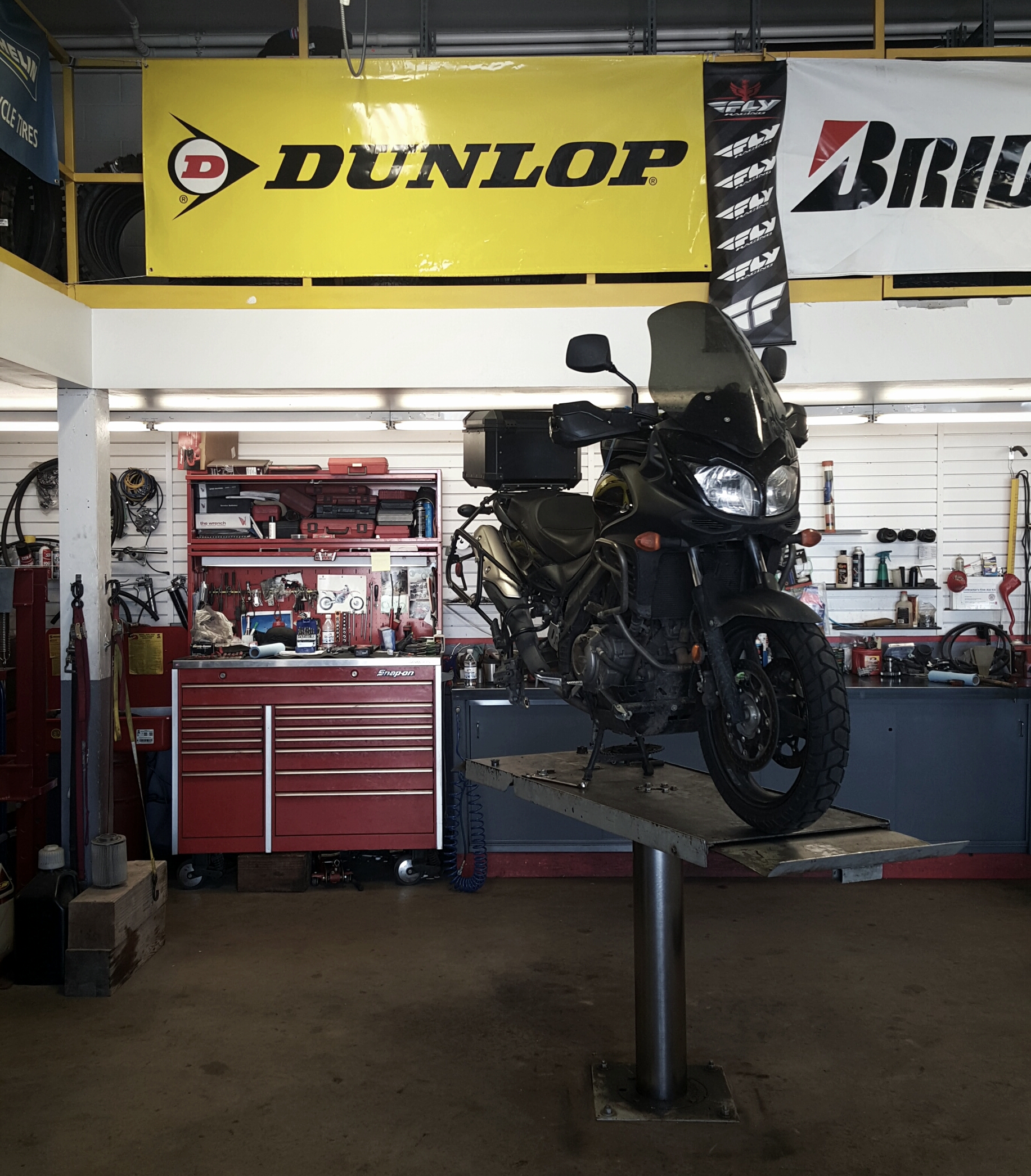 After a much appreciated history lesson on the Finlay, I head to Two Wheelz to see about a rear tire. I walk into the shop and I’m greated by the slightly frazzled shop owner named Matt. He takes one look at my riding suit and my bike parked outside and says: “you’ve been riding for a while, where you from?” I give him the rundown and he immediately springs into action. He tells me that he’s not sure if he has a tire that will fit and his mechanic is out with a broken arm due to a dirtbike accident over the weekend, but he will do what he can to get me back on the road.