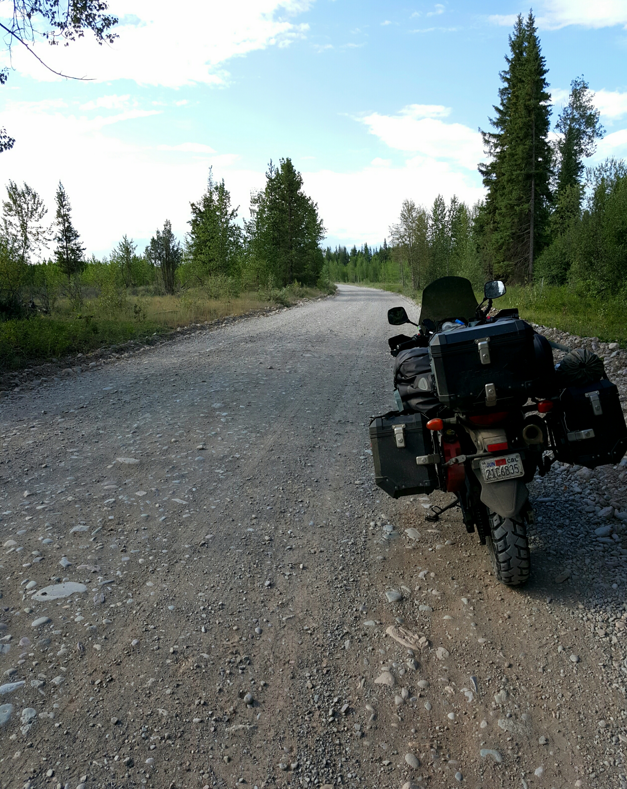 The pavement doesn’t last long and I find myself on a fairly rocky dirt road enroute to Bowman Lake, close to the Canadian border. The road progressively gets more rough and rocky and I start to become concerned that I’m risking popping a tire or rattling something loose on the bike. With all of my gear on the back, the bike is pretty heavily loaded for off-roading. When I carry more speed, the bumps smooth out but the rocks are harder to miss. I end up standing up on the footpegs and finding a rhythm of zigzagging between obstacles. Along the exhausting two hour ride in the dirt, I keep wondering if I was even going the right way and if I would end up stranded out here.