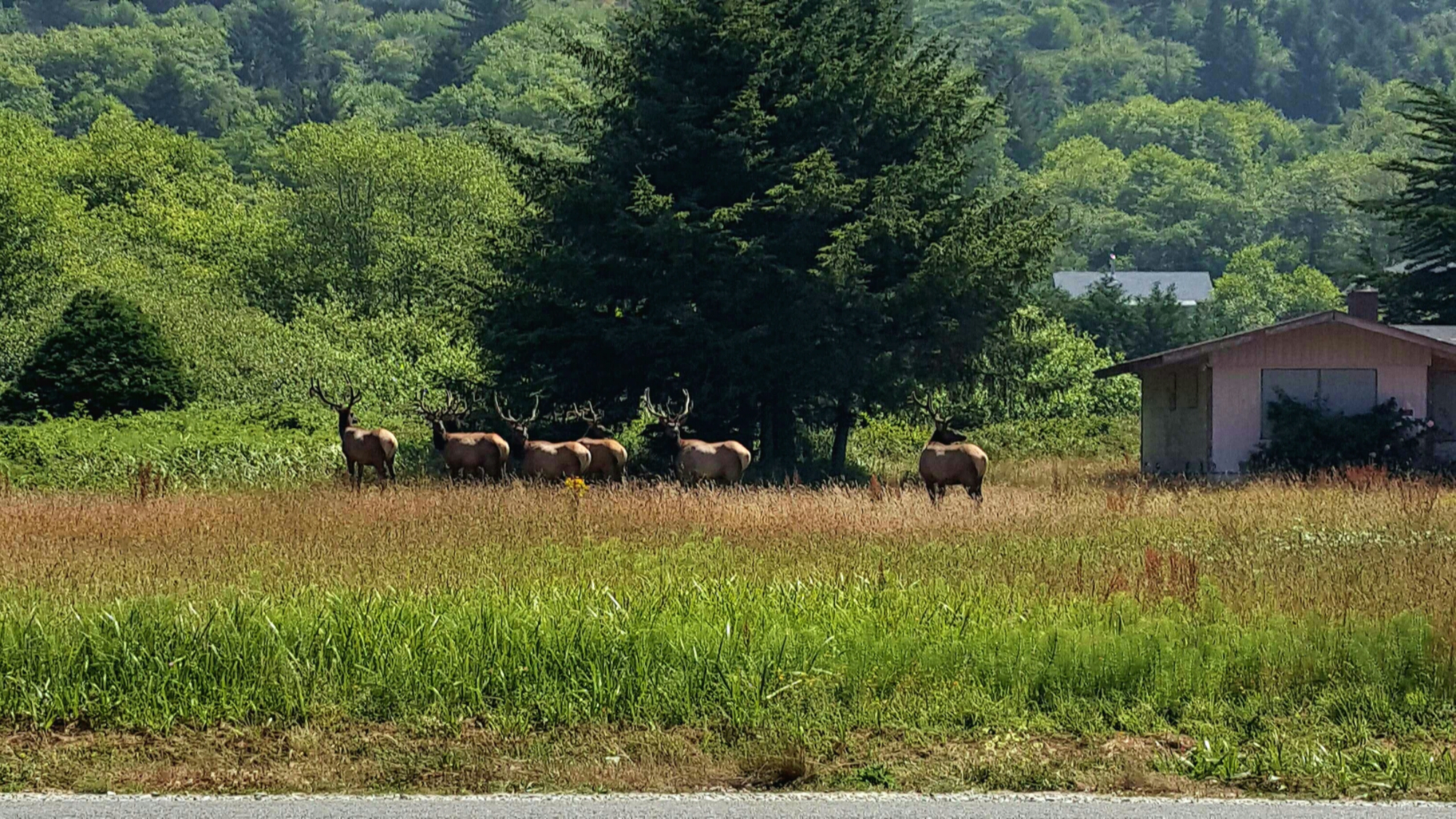A few miles into California I come across a herd of elk hanging out on someone’s front yard. They are surprisingly large as are their antlers. Their presence so close to the road quickly attracts a slew of passers-by stopping to snap photos of them.