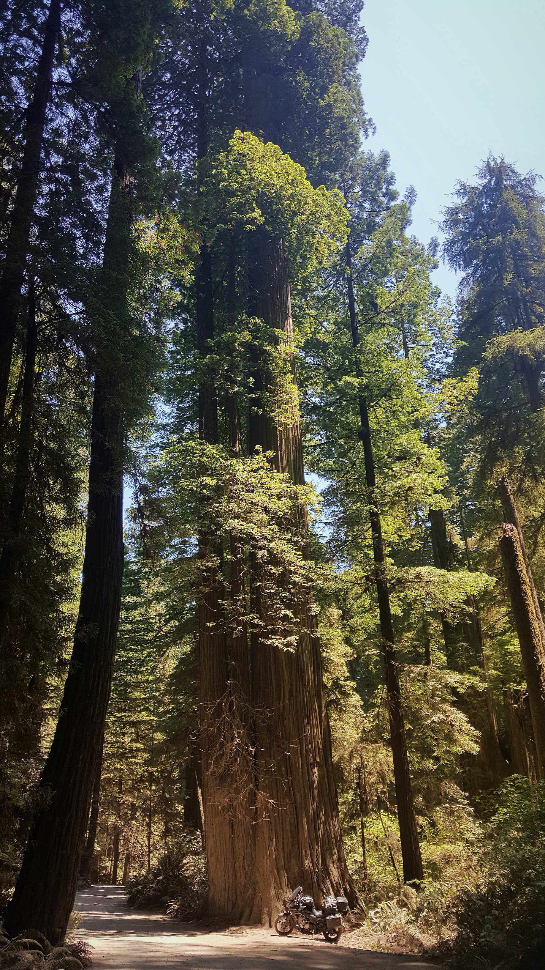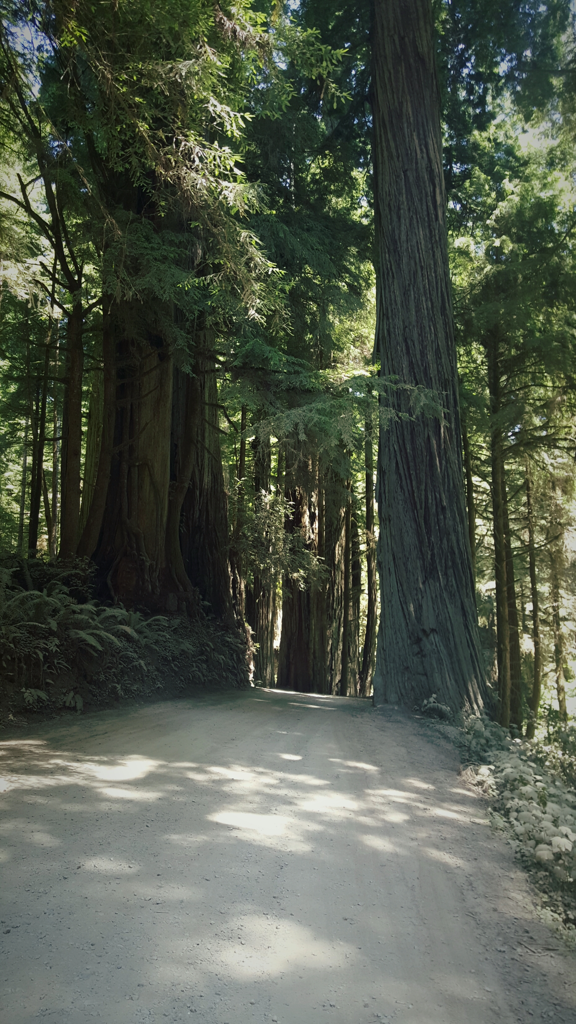 The only sign as I turn onto the road reads: motor homes and trailers prohibited. It doesn’t take long for the pavement to end and the skinny dusty road begins weaving around the bases of gargantuan redwood trees. The road is only wide enough for one vehicle, so oncoming cars must negotiate over little pullovers to pass each other. The scale of the trees and my proximity to them is mind blowing. The back of the map the friendly ranger gave me notes that they grow to a height of 380 feet and live to 2,000 years. They are so tall and densely packed I can’t really see to the top of the larger ones.
