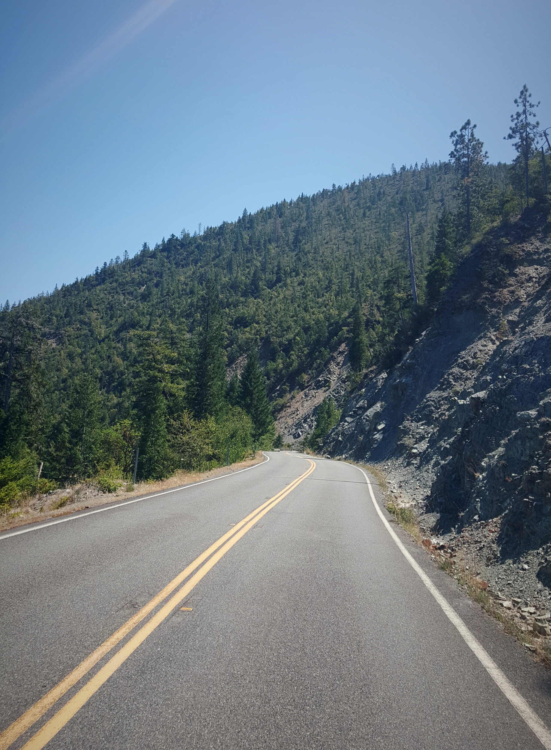 The winding road dumps me onto a paved road called South Fork Road. I don’t make it very far before I’m stopped for road construction by a guy wearing a hardhat and puffing on a cigarette. While we wait for the go-ahead, he tells me that he hates working on the road that goes nowhere. I inquire and he describes that the road is a thirty mile long deadend because the required clearances haven’t been granted by a Native American tribe to connect it at the other end. “Nobody uses this thing, have a blast on it!” he tells me as he waves me by. The new pavement perfectly paralleling a winding stream of turquoise meltwater is indeed completely empty and so much fun to ride on. I hit the campsite the ranger pointed me to and it’s also pretty much empty.
