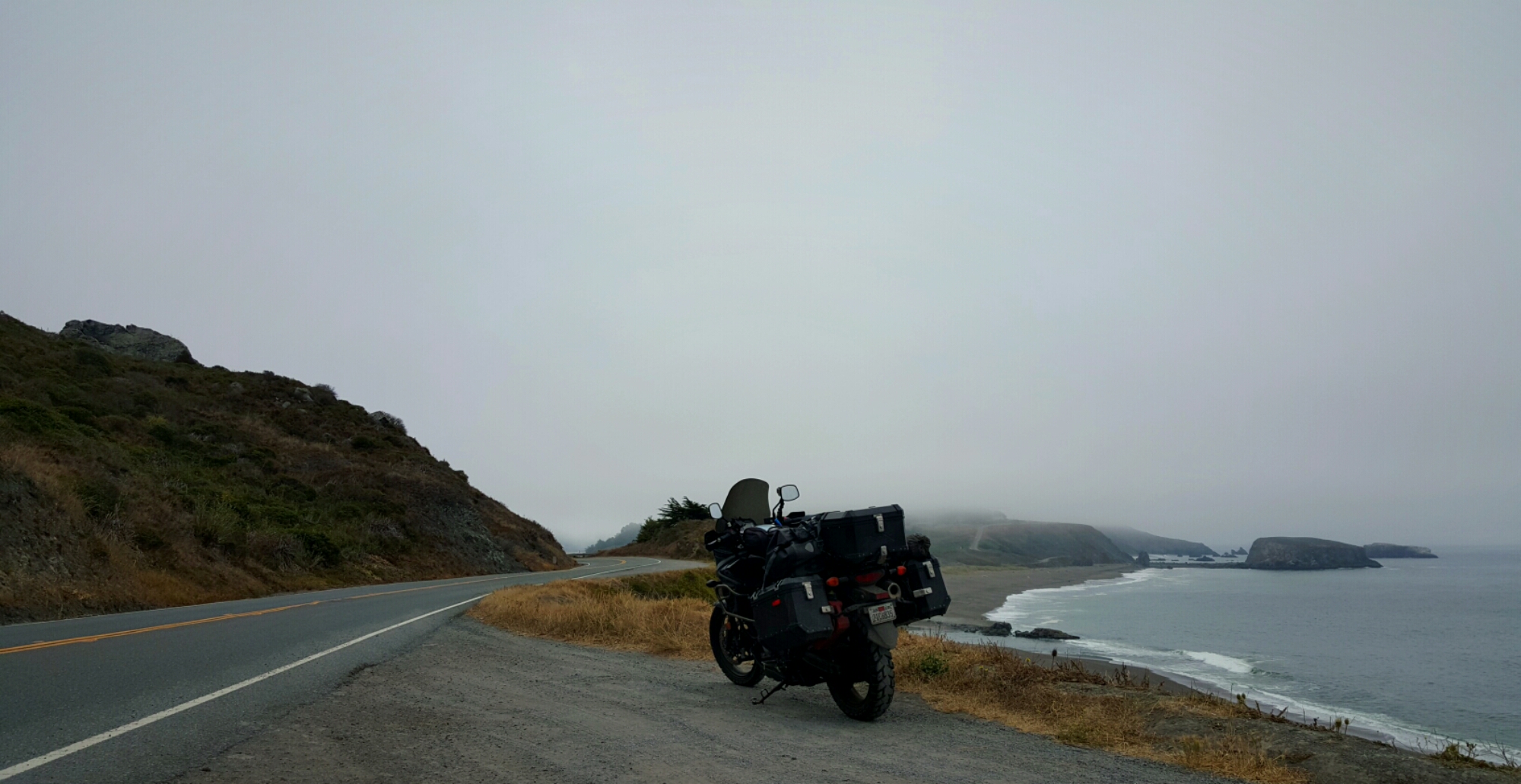 I rise early at my campsite and jump back on Highway 1. The thick coastal fog looms overhead. At one point near Jenner, CA, I drop into a valley on an amazing stretch of road and punch through the foggy ceiling.