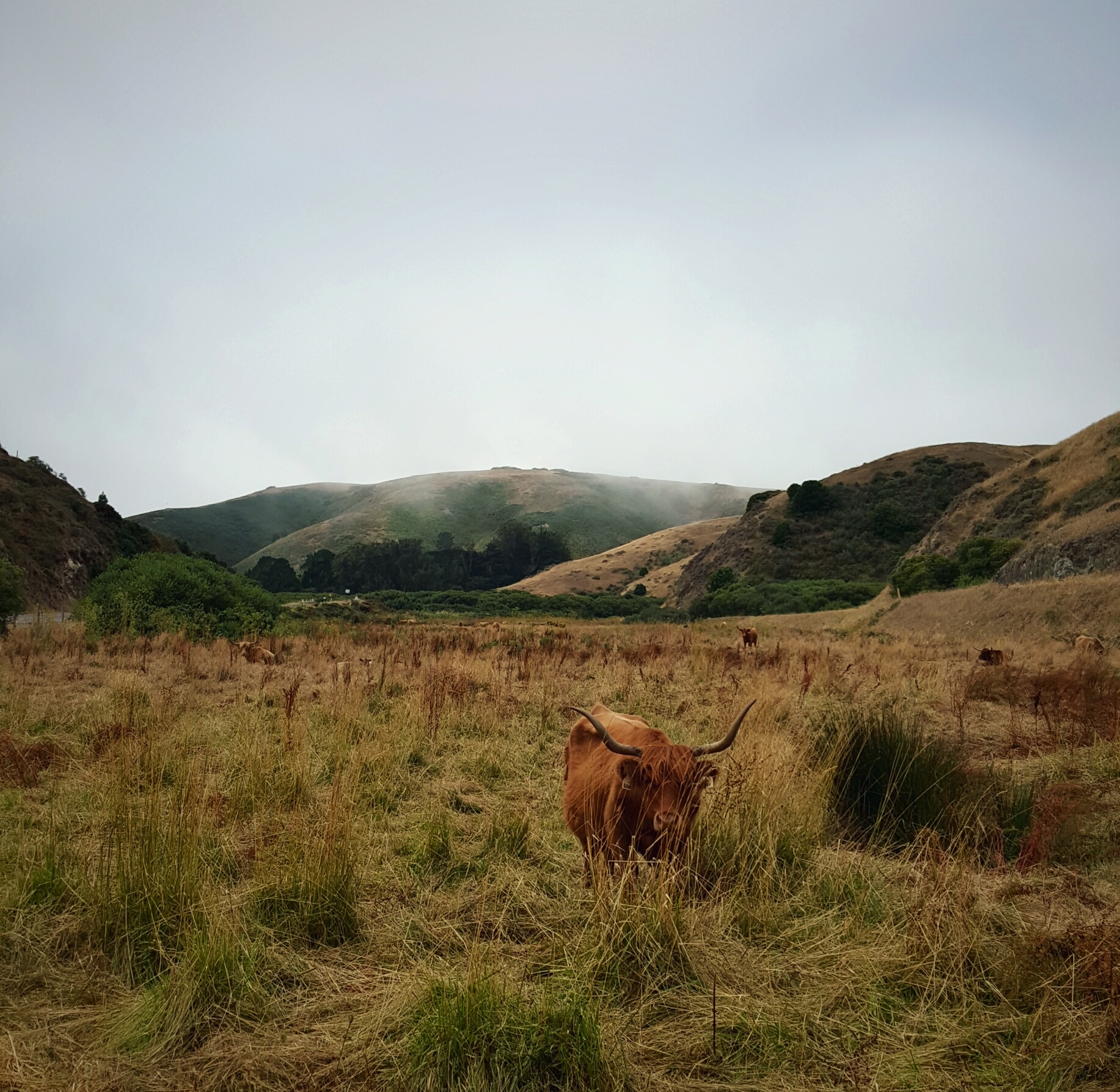 After breakfast, the highway leads me inland to more dry farmland. I can see the fog looming over the coast in the distance.