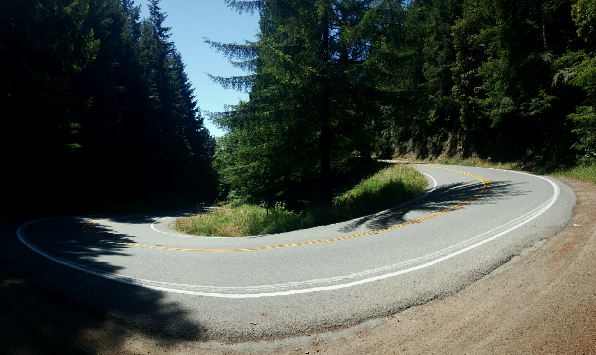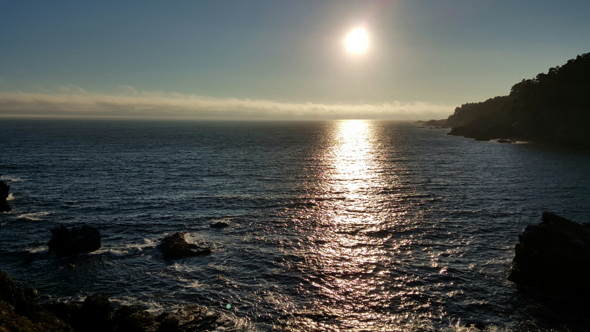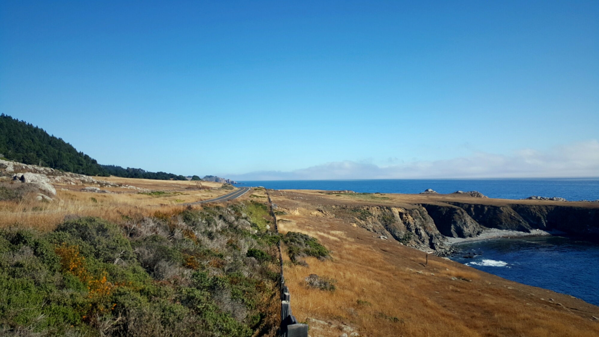 I eventually emerge from the woods at the ocean to very thick fog. As I ride south along the coast, the fog clears off and the beautiful views begin.